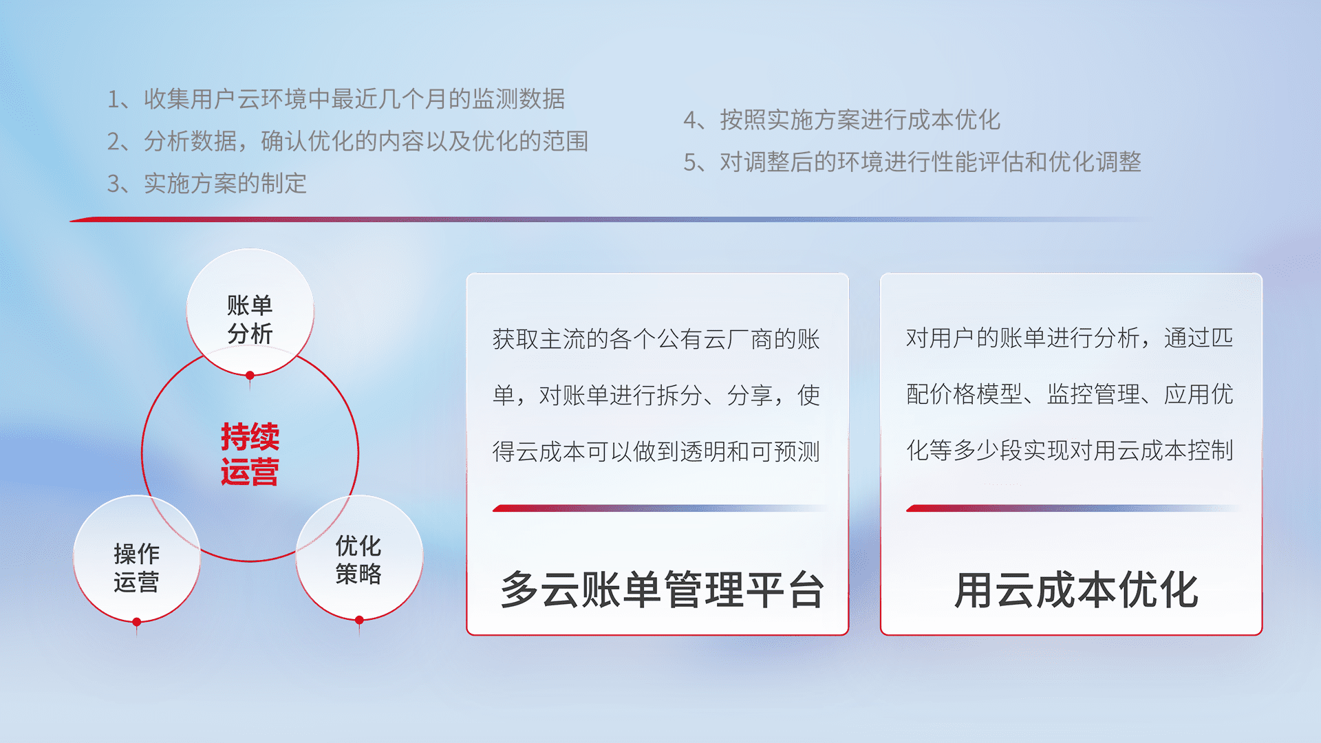 通过多云纳管,,以统一的资源数据模型把客户的云资源进行抽象和封装,,,进而实现对多云资源的统一操作,,,保障云资源管理的可靠性、、、、稳定性与可用性。。。量身定制化运维内容,,,配置、、、、开发运维、、补丁管理、、、、备份、、、、监控、、、、认证和访问管理、、审计和日常巡检等,,,保障在用云过程中的可靠度,,,,稳定度以及高可用率。。